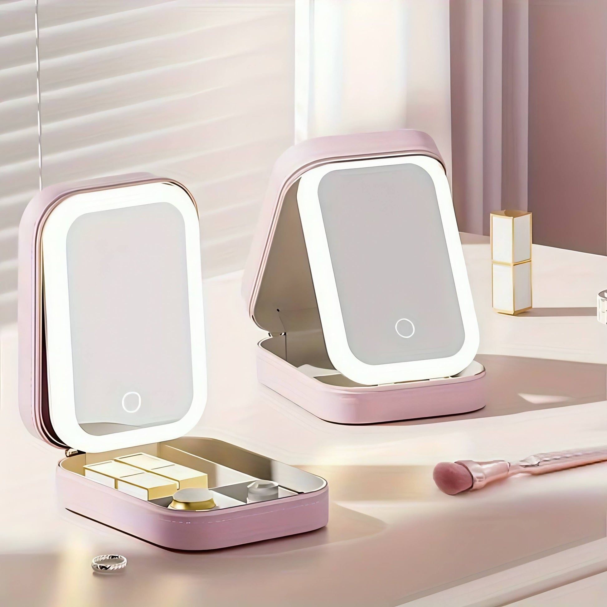 আয়না সহ LED লাইট মেকআপ স্টোরেজ বক্স - পোর্টেবল ট্র্যাভেল কসমেটিক অর্গানাইজার, টাচ কন্ট্রোল, 3টি সামঞ্জস্যযোগ্য উজ্জ্বলতা স্তর - Pink